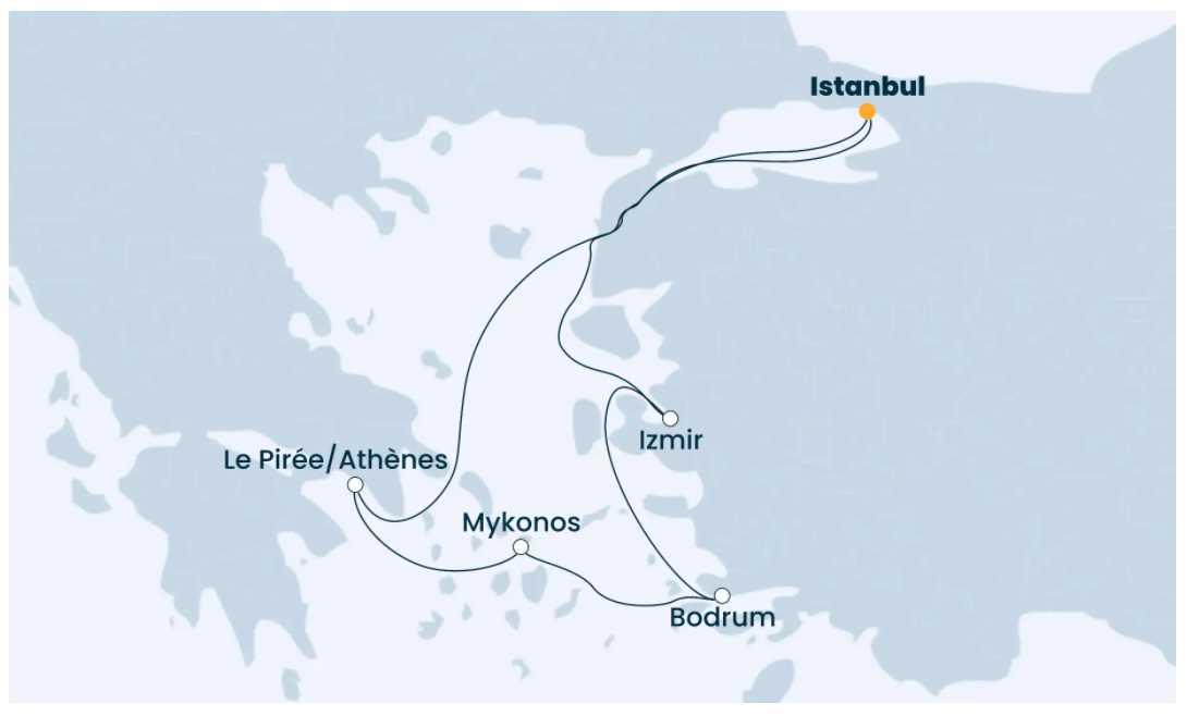 - Turkey, Greece. (Istanbul, Izmir, Bodrum, Athens, Mykonos)