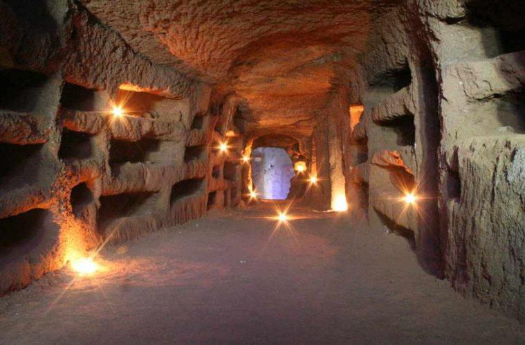 Tens of kilometers of deep long tunnels dug into the tufa just outside the city along the ancient consular roads where the Jews first, and then Christians, buried their loved ones waiting for their “resurrection”. You can admire the beautiful decorations and carvings on niches in memory of the people buried there.