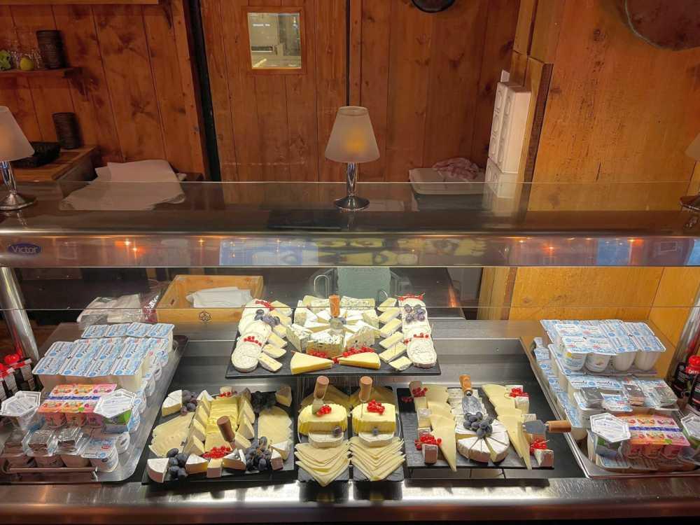 A generous buffet awaits you, offering a rich assortment of freshly baked pastries, a variety of salads, cheeses, dairy items, cereals, artisanal breads, and a wide range of hot and cold beverages. Live cooking stations serve made-to-order crêpes and omelets.