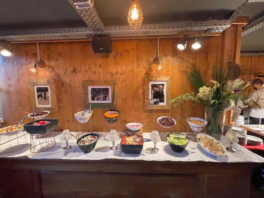 Variety of salads, meat and fish , sides, and hot specialty. Gourmet dessert plate