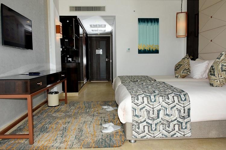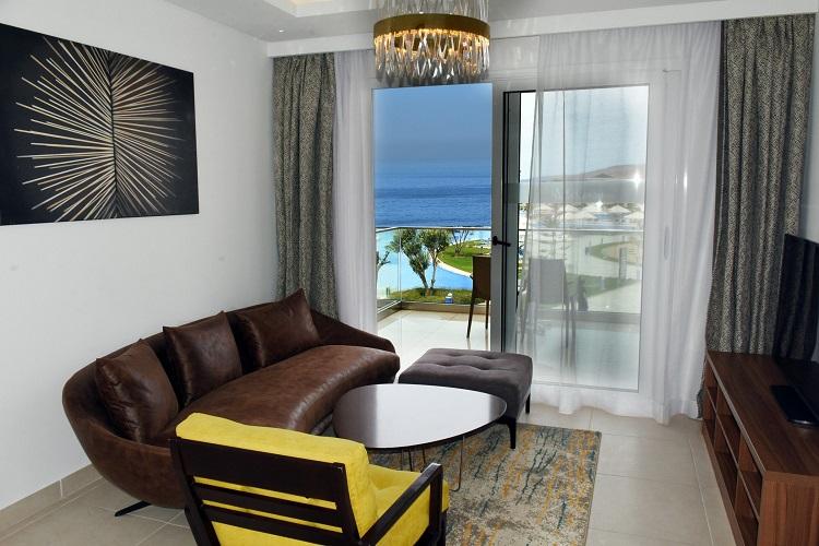 Luxurious Prestige Suites where you can admire the breathtaking view of the sea and the beach of Taghazout composed of 1 bedroom, 1 living room, 1 bathroom. Equipment: telephone, satellite TV, air conditioning, mini bar, kettle, safe, hair dryer, balcony or terrace, bathroom with shower cabin.