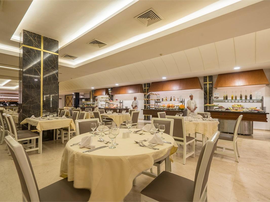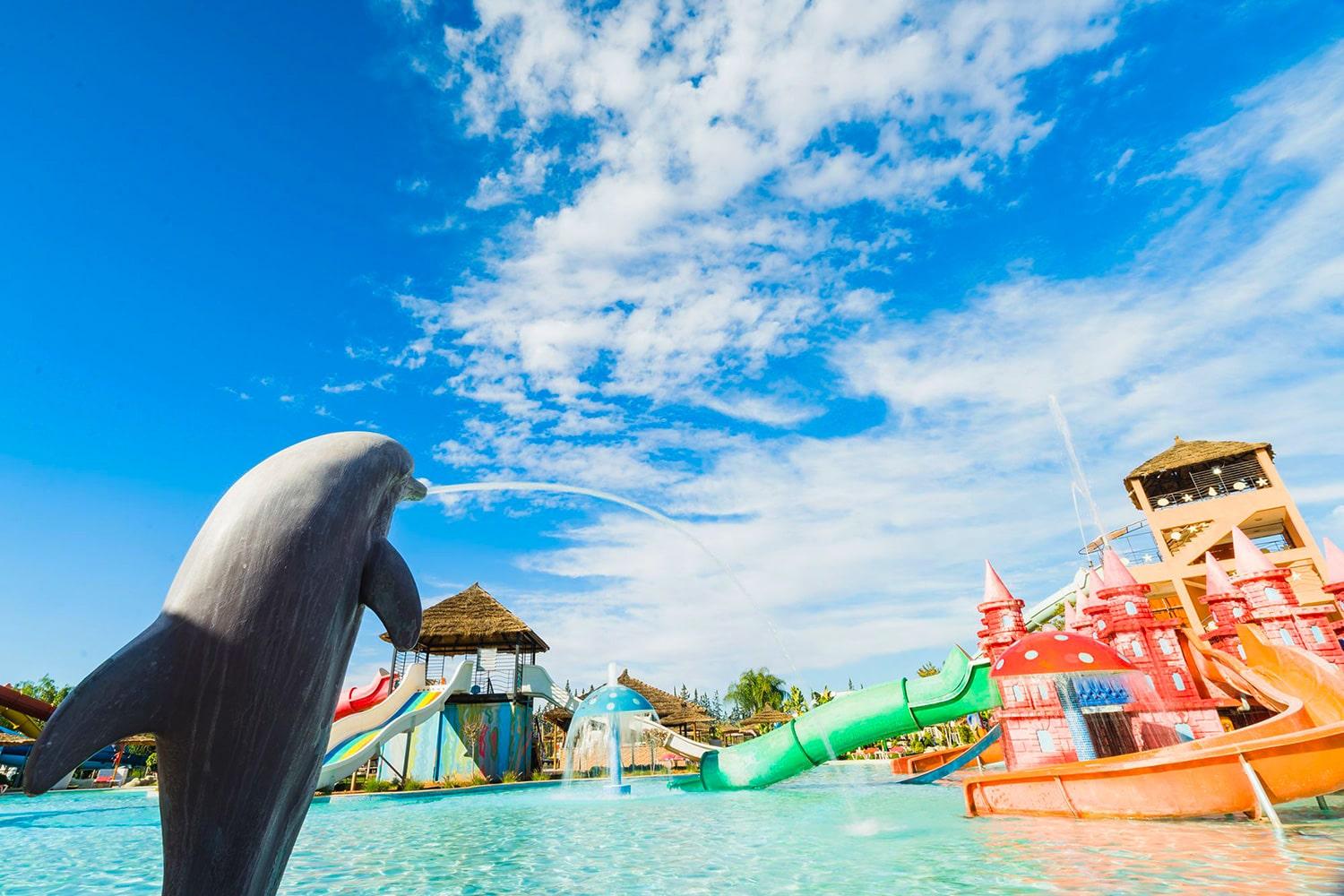 The hotel offers 15 outdoor pools, 2 heated indoor pools, 21 slides for adults and 37 for children, an artificial river, a wave pool, a Kids Club, a wellness center with hammam, sauna, massages, treatments.