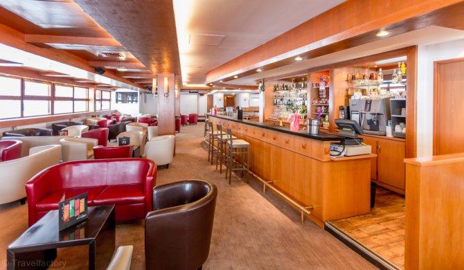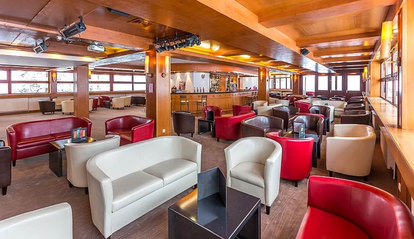 A large panoramic restaurant, large lounges, bar, pool table,