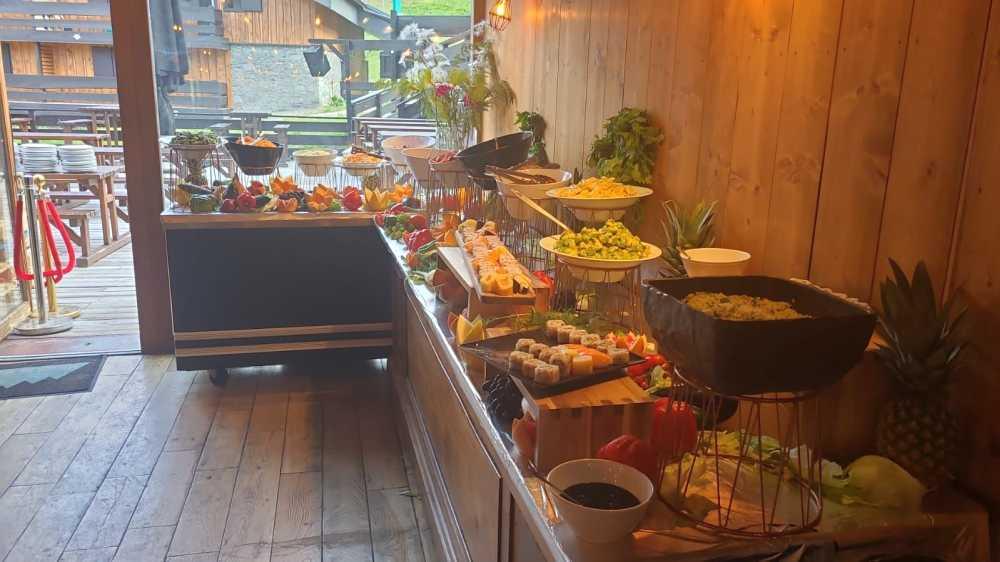 Generous buffet awaits you, offering a rich assortment of freshly baked pastries, a variety of salads, cheeses, dairy items, cereals, artisanal breads, and a wide range of hot and cold beverages. Live cooking stations serve made-to-order crêpes and omelets.